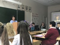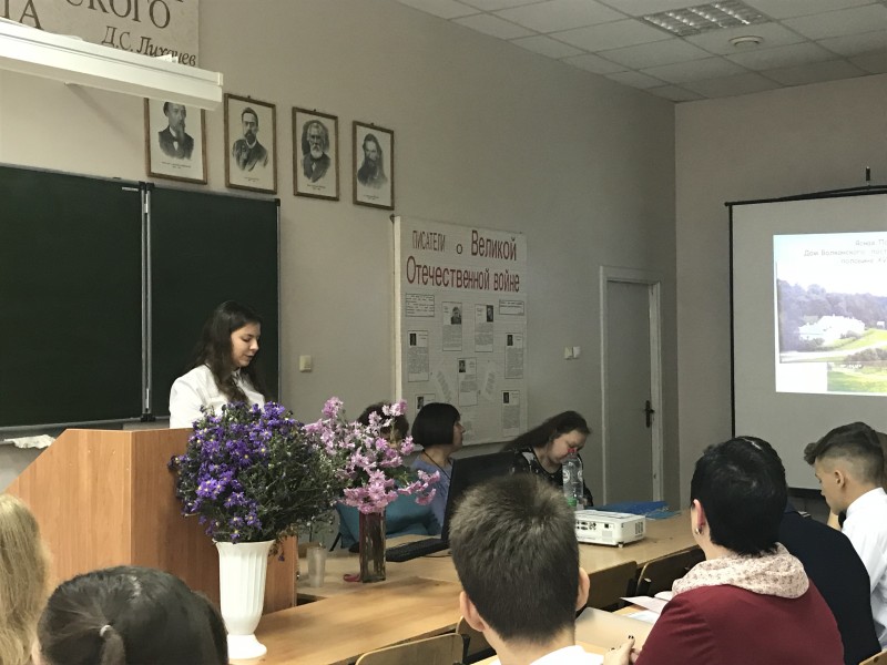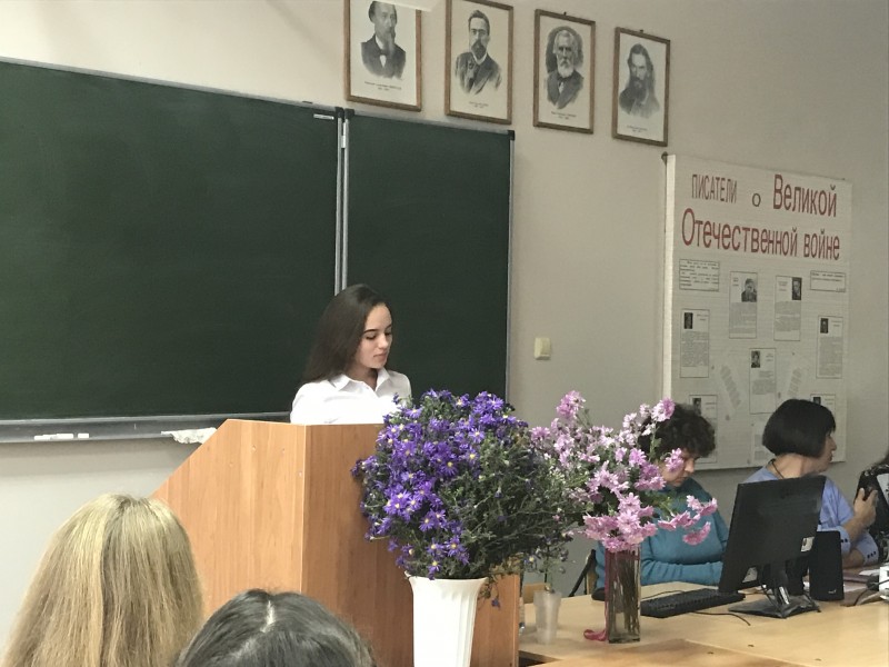 "Борисоглебскую гимназию №1" представляли ученица 10 "А" класса  Мышьякова Анастасия с докладом на тему "Литературные места на карте России. Ясная поляна" (рук-ль Мышьякова И.Я.), ученица 10 "Б" класса Тарасова Кристина с докладом на тему "Личность Л.Н.Толстого, его биография" (рук-ль Мышьякова И.Я.) и ученица 11 класса Кутепова Анастасия с рассуждением на тему "Моя любимая героиня Л.Н.Толстого" (рук-ль Крылова Э.В.). Кроме биографии, интересных фактов из жизни писателя и его героев, в этот день много говорили об иллюстрациях и экранизациях, посвящённых творчеству писателя, о поэтике толстовских произведений.