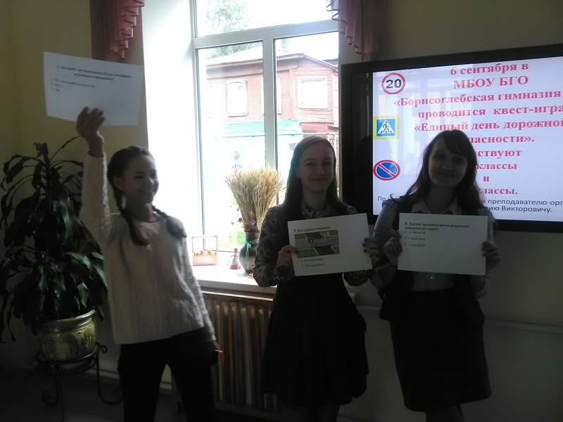 6 сентября 2017 года в МБОУ БГО «Борисоглебская гимназия №1» состоялся Единый день дорожной безопасности. В рамках Единого дня дорожной безопасности была проведена игра-квест «Единый день дорожной безопасности» для 4-6 и 8-9 классов. В рамках игры участники отвечали на вопросы по правилам дорожного движения, правилам поведения на улице, дороге и вождения велосипеда. Лучшие гимназисты отмечены грамотами и памятными призами.