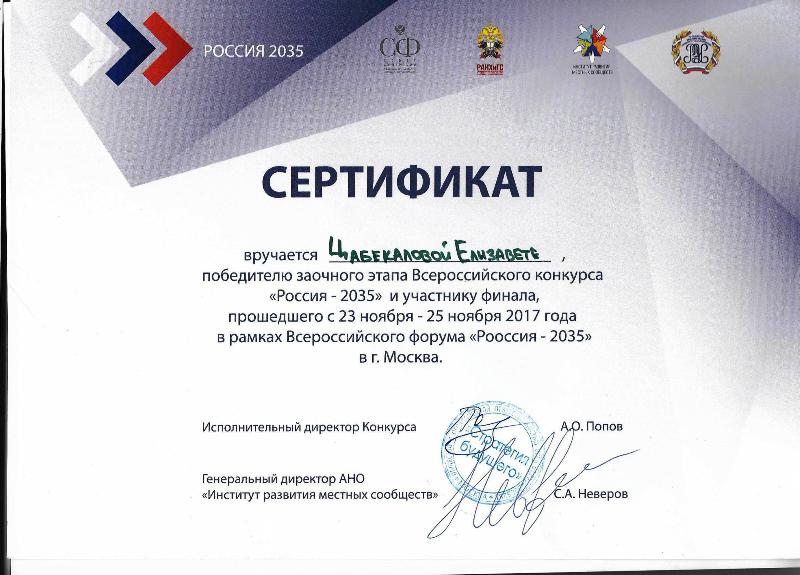 В октябре - ноябре 2017 года проходил необычный Всероссийский конкурс молодежных проектов стратегий социально-экономического развития «РОССИЯ-2035». Обучающаяся 10 класса Цабекалова Елизавета и её наставник учитель обществознания Голомазова Ж.М. выступили с темой "Формирование гражданского общества как необходимое условие процветания России". Наша работа победила в заочном этапе этого конкурса и Елизавета была приглашена в Москву в составе группы ребят из Воронежской области на Всероссийский форум. Елизавета достойно представила свою работу, за что получила Сертификат. ПОЗДРАВЛЯЕМ!!!!