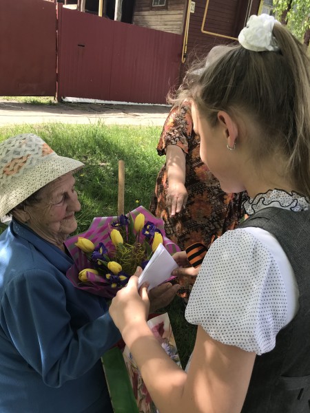 8 мая активисты 5 класса Недорезова Анастасия, Бирюк Анна и Окунева Алёна поздравили с приближающимся праздником - Днём Победы - ветерана тыла Суховерхову Александру Ивановну.