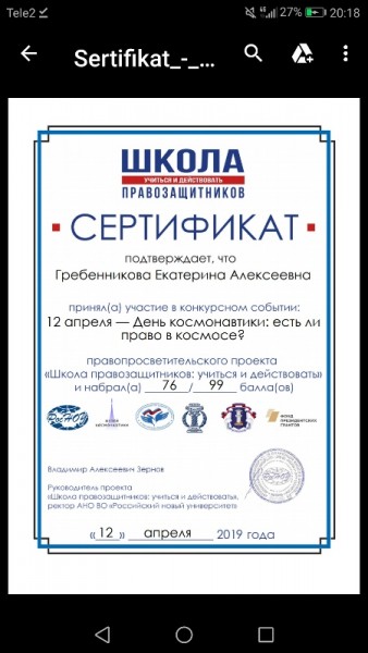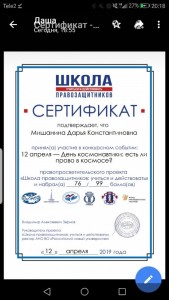 Команда "Правовые волонтеры"  (Мишанина Д., Кандыба С., Мещерякова А., Тарасова К.,   Пашинина Л., Мизгина Е., Гребенникова Е., Косинова Д. и руководитель Голомазова Ж.М.)в рамках проекта "Школа правозащитников: учиться и действовать" приняли участие в викторине "12 апреля — День космонавтики: есть ли право в космосе?"