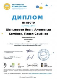 Поздравляем с дипломом 3 степени  в конкурсе "Безопасное медиадетство" Шаньшерова Ивана, обучающегося 11 "Б" класса!