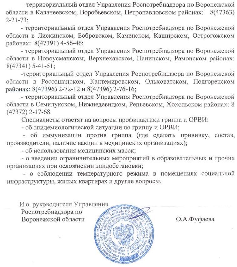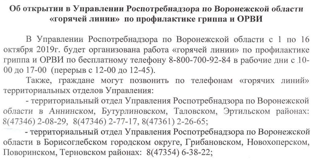 Об открытии в Управлении Роспотребнадзора по Воронежской области "горячей линии" по профилактике гриппа и ОРВИ