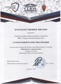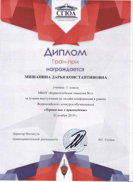 Мишанина Дарья (обучающаяся 11 "Б") победила во втором туре Всероссийского конкурса "Первые шаги в правоведении" по результата очного участия, в котором нужно было обосновать необходимость усовершенствования законодательства...