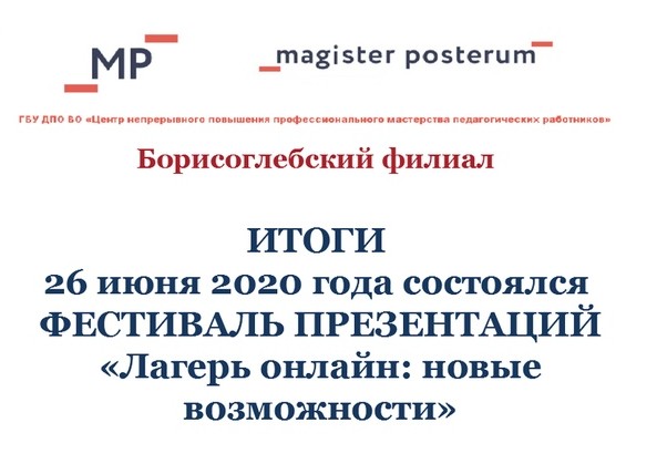 Подведены итоги фестиваля презентаций "Лагерь онлайн: новые возможности", проведенного Борисоглебским филиалом ГБУ ДПО ВО «Центр непрерывного повышения профессионального мастерства педагогических работников». 26 июня 2020 г. состоялась онлайн-защита презентаций участниками фестиваля  "Лагерь онлайн: новые возможности".