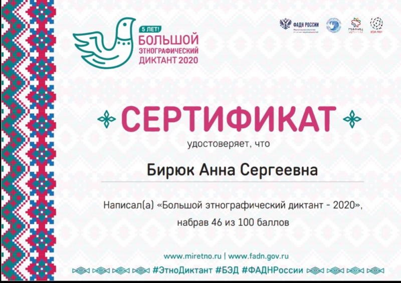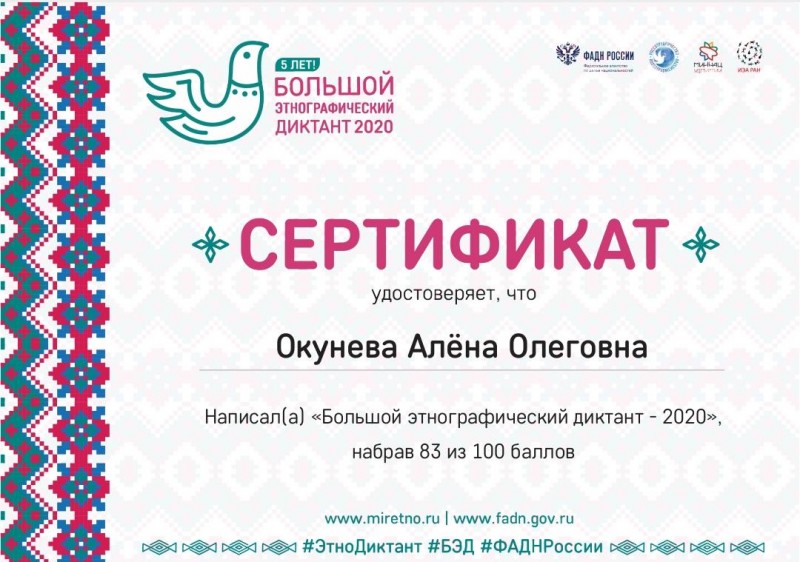 Осенние каникулы-2020 были длиннее обычного. Ограничения массовых мероприятий не помешало, тем не менее, гимназистам 8 класса провести каникулярное время с пользой. Ребята приняли активное участие в муниципальном этапе Всероссийской олимпиады школьников 2 и 6 ноября, проверили знание этнографии не только в границах Российской Федерации,но и попытались ответить на вопросы, касающиеся краеведения и этнографии Воронежского края, приняв участие в этнографическом диктанте. Большой этнографический диктант - это просветительский проект, который знакомит с культурой народов, проживающих в России, а также позволяет оценить общий уровень этнокультурной грамотности.Формат проведения - онлайн. Классный руководитель Крылова Э.В. тоже прошла это испытание. Теперь мы точно знаем, что черный цвет вышивки на народном костюме Воронежской области олицетворяет чернозём, а смешение русского языка и южного говора называется суржиком.