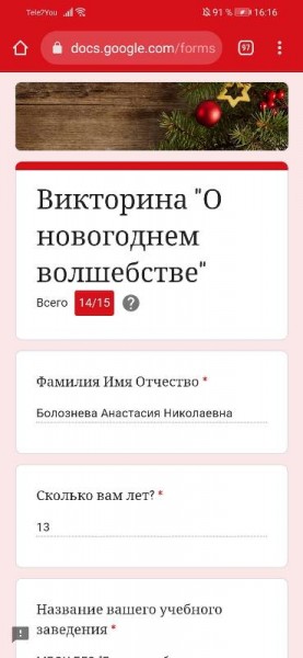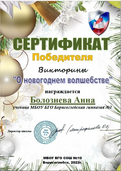 С 29 декабря 2021 года по 11 января 2022 года МБОУ БГО СОШ №10 для школ Борисоглебского городского округа проводили викторину "О новогоднем волшебстве". Более 300 человек приняли в ней участие, из них 57 человек правильно ответили на все 15 вопросов. Организаторы поздравили победителей и поблагодарили всех за участие! Гимназисты 7 класса (классный руководитель Громова Т.С.) приняли активное участие и 7 человек стали победителями: Болознева А., Гуторова Е., Касьянова А., Косинов М., Лекомцева А., Тарасова П.