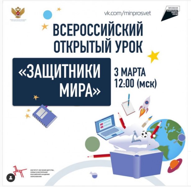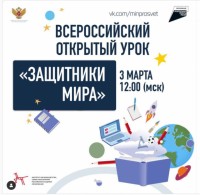 3 марта 2022 г. в 12:00 (по московскому времени) состоялся Всероссийский открытый урок «Защитники мира», участниками которого стали обучающиеся 9 класса (классный руководитель Крылова Э.В.). Эфир был посвящён освободительной миссии на Украине. Проект инициирован Министерством просвещения России.