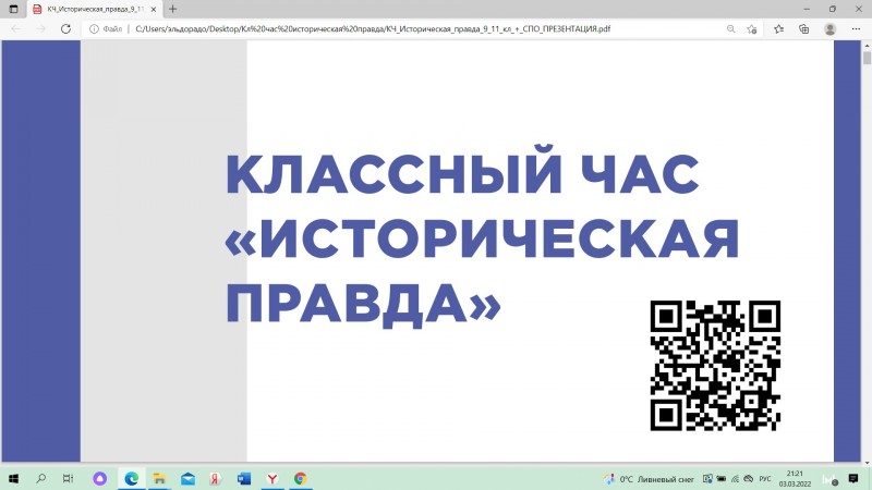 2 марта 2022 г. в 9 классе состоялся классный час на тему «Историческая правда». Девятиклассникам был предложен краткий экскурс в историю многовековых отношений между дружественными народами Украины и России. Ребята размышляли над ответом на вопрос «Можно ли переписать историю?» и насколько опасно подобное отношение к историческим фактам. В конце абсолютно взрослого диалога классный руководитель 9 класса Крылова Э.В. обратила внимание ребят на необходимость быть очень внимательными к различного рода источникам информации, которые сегодня претендуют на статус «самых правдивых». В этом перечне точно не может быть социальных сетей, чья задача – собрать как можно больше «лайков».