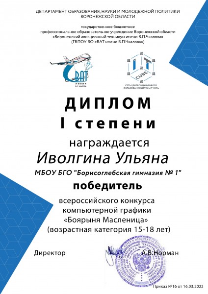 Подведены итоги всероссийского конкурса по компьютерной графике «Боярыня Масленица». Он объединил креативных ребят из многих городов, таких как Воронеж, Балашов, Борисоглебск, Великий Новгород, Магнитогорск, Липецк, Воткинск, Сочи, Тамбов, Сатка и других!
