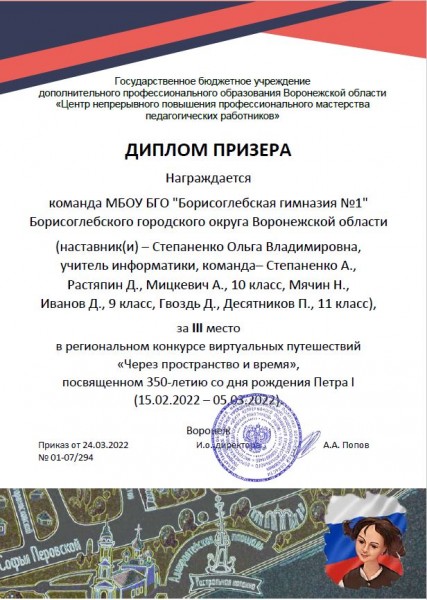 Подведены итоги регионального конкурса виртуальных путешествий «Через пространство и время», посвященного 350-летию со дня рождения Петра I, проведенного в рамках цикла региональных мероприятий "Петровские Ассамблеи" лабораторией развития профессионального мастерства педагогов ВЦПМ.