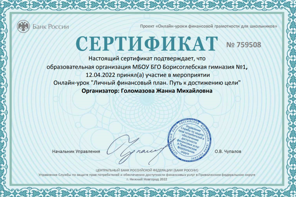 12 апреля обучающиеся 10 класса вместе с учителем Голомазовой Ж.М. стали участниками интересного урока от Банка России "Личный финансовый план. Путь к достижению цели".