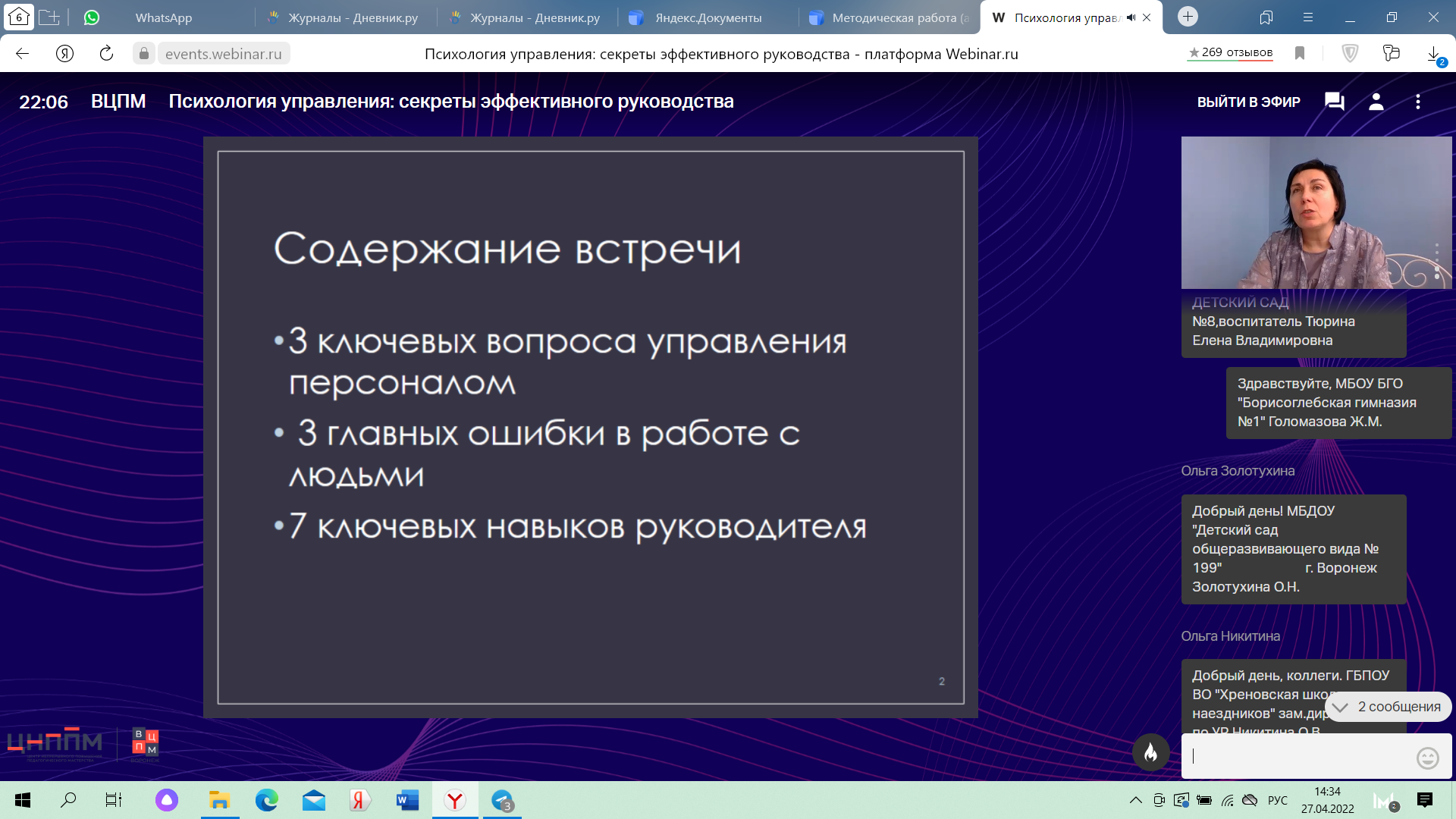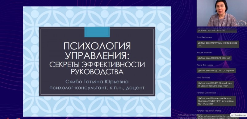 27 апреля 2022 г.  состоялся вебинар по теме "Психология управления: секреты эффективного управления" , который был интересен не только руководящим работникам, но и педагогам, т.к. они управляют коллективом детей.. Главное правило - чувство, настроение. Вебинар проводила старший научный сотрудник научно - исследовательского центра ВУНЦ ВВС ВВА, к.п.н. доцент, психолог - консультант Скибо Т.Ю.