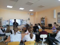 Обучающиеся 9 и 8 класса встретились с настоятелем храма Бориса и Глеба отцом Александром, который побеседовал с детьми на разные темы: военная операция на Украине, великие русские люди, роль образования в жизни.