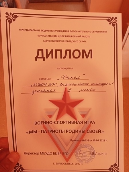 10 июня 2022 г. на базе МБОУ БГО СОШ №6 состоялась военно- спортивная игра «Мы патриоты Родины своей!», посвященная всероссийскому празднику «День России». Не остались в стороне и гимназисты. В игре приняли участие ребята, посещающие лагерь с дневной формой пребывания детей - профильную спортивную смену "спортивный отряд «Факел»". В рамках конкурса участникам необходимо было пройти шесть станций, где необходимо проявить свои физические качества, эрудированность, память, вокальные данные и туристические знания. Гимназисты успешно справились с заданиями и  заняли второе общекомандное место.