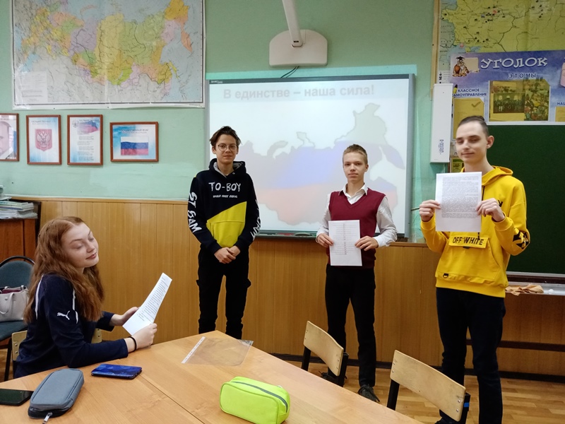 2 ноября 2022 г. в 9 «А» классе (классный руководитель Золотухина Е.И.) состоялось мероприятие «В единстве – наша сила!», посвящённое Дню народного единства. Обучающиеся работали в группах. Разгадав кроссворд с ключевой фразой «единство народа», ребята из группы под названием «Историки» вспомнили историю праздника. Группа «Художники» трудилась над представлением зрительного (графического) образа слова «единство». В ходе совместной работы девятиклассники сделали главные выводы: нужно воспитывать в себе чувство патриотизма, толерантности, уважения, ответственности и гордости за свою страну.