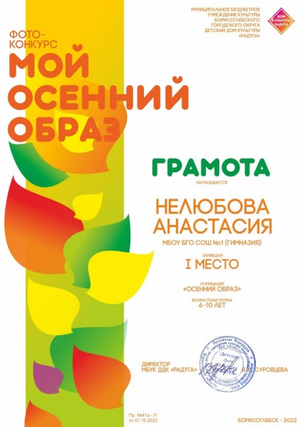 В номинации «Осенний образ» 1 место заняла ученица 1 «А» класса Нелюбова Анастасия (кл. рук. Негадова О.П.)