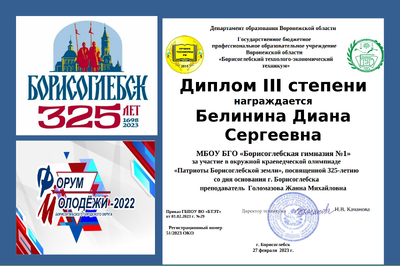 Студенческий совет ГБПОУ ВО «Борисоглебский технолого-экономический техникум» 27 февраля 2023 года провели заочную окружную краеведческую олимпиаду «Патриоты Борисоглебской земли», посвященную 325-летию со дня основания г. Борисоглебска. Эта олимпиада была заявлена, как молодежная инициатива 2023 года, утвержденная решением Форума молодежи 2022, а также мероприятие, посвященное 325-летию со дня основания г. Борисоглебска. Окружная краеведческая олимпиада «Патриоты Борисоглебской земли» проходила с 3 по 27 февраля. В олимпиаде приняли участие школьники и студенты Борисоглебского городского округа: ГБПОУ ВО «Борисоглебский сельскохозяйственный техникум», ГБПОУ ВО «Борисоглебский дорожный техникум», ГБПОУ ВО «Борисоглебский техникум промышленных и информационных технологий», ГБПОУ ВО «Борисоглебский технолого-экономический техникум», МБОУ БГО ООШ №11, МКОУ БГО Ульяновская СОШ, МБОУ БГО СОШ №3, МБОУ БГО СОШ №13, МБОУ БГО «Борисоглебская гимназия №1».