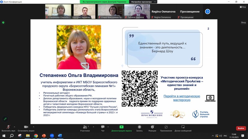 11 октября 2023 г. Степаненко Ольга Владимировна, учитель информатики МБОУ БГО "Борисоглебская гимназия № 1" выступила спикером на круглом столе "Инженерные классы: прокладывая маршрут в профессию инженера"  в рамках работы Всероссийской онлайн-конференции "Большая педагогическая неделя" (9 - 13 октября 2023 г.), проводимой ГК «Просвещение».  Подробнее: https://uchitel.club/conferences/teacherweek