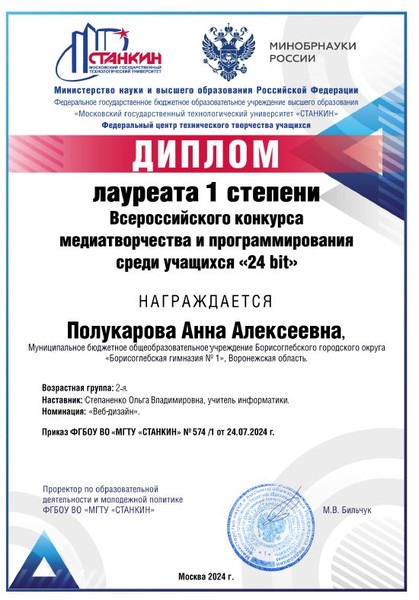 В июле 2024 г. были подведены итоги Всероссийского конкурса  медиатворчества и программирования среди учащихся «24 bit»  в рамках Всероссийского открытого фестиваля научно-технического творчества учащихся «Траектория технической мысли-2024» МГТУ "СТАНКИН" (пункт 391 приказа Минпросвещения РФ от 31.08.2023 №649). Команда МБОУ БГО "Борисоглебская гимназия №1" (руководитель Степаненко О.В., учитель информатики) показала отличные результаты: