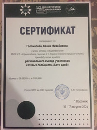 16-17 августа 2024 г. учитель истории и обществознания, экономики Голомазова Жанна Михайловна стала участником регионального съезда участников сетевых сообществ "Сети идей" в составе коллег, представляющих региональное отделение Всероссийской Ассоциации учителей истории и обществознания.  В течение двух дней коллеги стали участниками тренингов, интеллектуальных квизов, мастер - классов. После такого интенсива, можно смело сказать - к новому учебному году готовы!!!