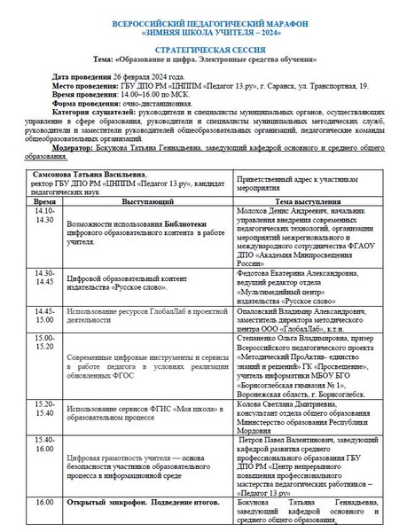 26 января 2024 г. Степаненко Ольга Владимировна, учитель информатики МБОУ БГО "Борисоглебская гимназия №1", приняла участие в стратегической сессии «Образование и цифра. Электронные средства обучения» в рамках Всероссийского педагогического марафона "Зимняя школа учителя - 2024" с докладом на тему "Современные цифровые инструменты и сервисы в работе педагога в условиях реализации обновленных ФГОС". Организатор марафона: ГБУ ДПО РМ «ЦНППМ «Педагог 13.ру», г. Саранск