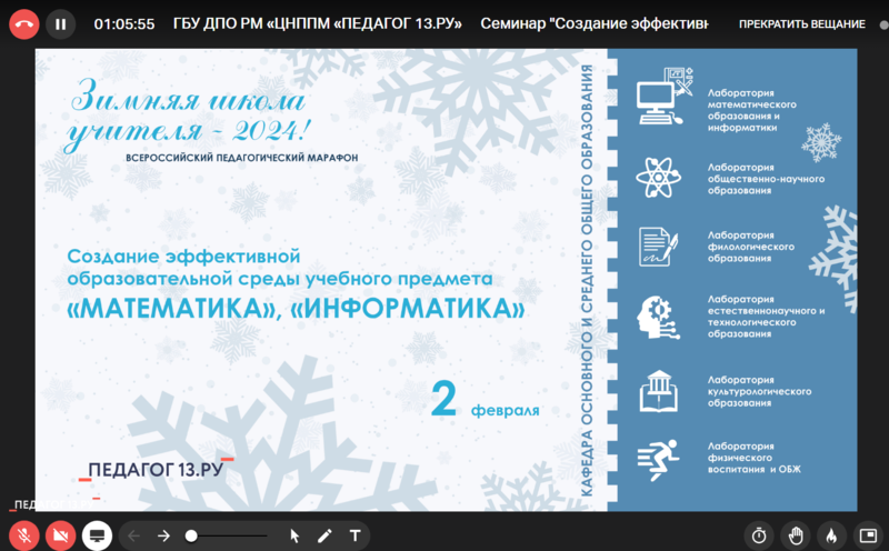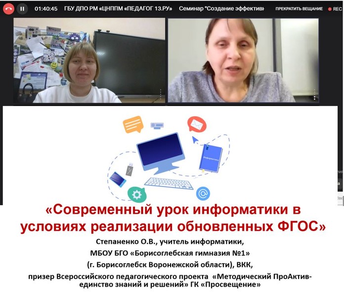 2 февраля 2024 г. Степаненко Ольга Владимировна, учитель информатики МБОУ БГО "Борисоглебская гимназия №1" приняла участие в семинаре "Создание эффективной образовательной среды учебного предмета "Информатика", "Математика" в рамках Всероссийского педагогического марафона "Зимняя школа учителя - 2024" с докладом на тему "Современный урок информатики в условиях реализации обновленных ФГОС". Организатор марафона: ГБУ ДПО РМ «ЦНППМ «Педагог 13.ру», г. Саранск.