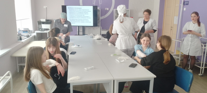 6 марта 2024 года девочки 7 "В" класса посетили профробу "Медицинская сестра" на базе Борисоглебского медицинского колледжа. Обучающимся рассказали о классификации медицинских повязок по их назначению и типу перевязочного материала, продемонстрировали технику и способы наложения повязок на отдельные части тела. Затем, девочки, разбившись на пары, тренировались друг на друге в наложении повязок на пальцы руки, локтевой и плечевой суставы. Полученные знания и приобретенные умения очень важны для жизни, так как медицинская повязка является мощным лечебным инструментом, способным повлиять на процесс выздоровления.