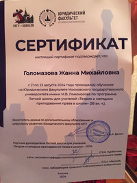 С 21 по 23 августа 2024 г. наш учитель Голомазова Жанна Михайловна стала участником Летней школы для учителей "Теория и методика преподавания права в школе". В течение трех дней преподаватели по гражданскому, семейному, трудовому, административному, уголовному, конституционному отраслям права рассказывали о новеллах в законодательстве, делились особенностями преподавания права.