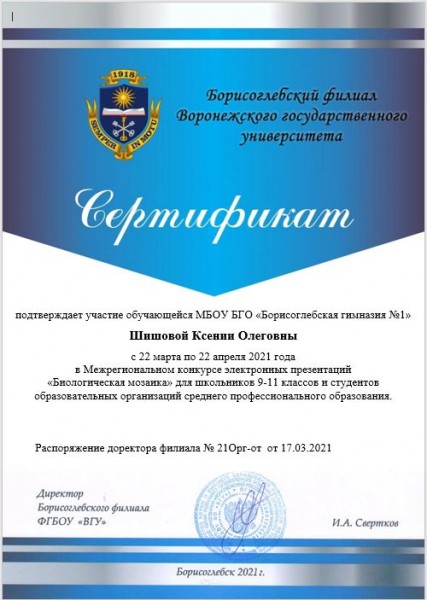Шишова Ксения (9 "Б" класс МБОУ БГО «Борисоглебская гимназия № 1») - участник (руководитель Громова Т.С.)