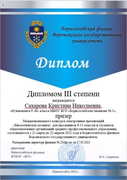 Сахарова Кристина (9 "Б" класс МБОУ БГО «Борисоглебская гимназия № 1») - 3 место (руководитель Громова Т.С.)