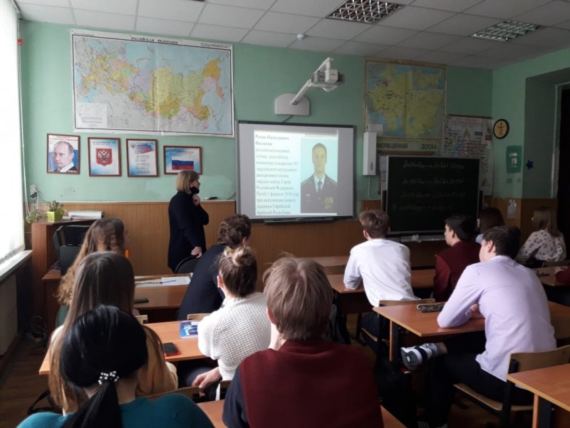 Девятиклассники вспомнили имена героев. Среди них Роман Николаевич Филипов - российский военный лётчик, заместитель командира эскадрильи 187 гвардейского штурмового авиационного полка, гвардии майор. Герой Российской Федерации. Он погиб 3 февраля 2018 года при выполнении облёта зоны деэскалации «Идлиб» для контроля режима прекращения огня ведущий в паре российский штурмовик Су-25СМ под управлением майора Филипова вблизи города Серакиб был сбит выстрелом из переносного зенитного ракетного комплекса. Журналисты В. Н. Баранец и А. И. Коц отмечают, что, по оценке опрошенных ими экспертов, ПЗРК был, предположительно, системы «Стингер»; согласно другим данным, это был ПЗРК советского производства. Член сирийской группировки «Джейш Идлиб Хур» Махмуд Хадж Исмаил с позывным «Кастро» заявил, что сбил российский штурмовик из зенитной установки ЗУ-23-2. Лётчик попытался удержать самолёт в воздухе и доложил, что атакован ракетой, после чего катапультировался. На земле пилот попал в окружение боевиков и погиб в последовавшем за этим бою: отстреливаясь от нападавших из пистолета Стечкина, был тяжело ранен, а затем подорвал себя гранатой со словами «Это вам за пацанов!». Ведомый командира звена штурмовиков поддерживал командира огнём с воздуха, выполнил несколько атак, отработал по машинам, которые приближались к оливковой роще, где был Роман. Уничтожил два автомобиля и покинул зону только по аварийному остатку топлива.