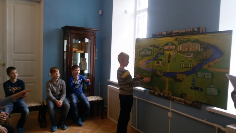 Вторая часть занятия была не менее интересной и увлекательной. Сначала ребята создавали свою дворянскую усадьбу! Да, да! На карте живописной местности размещали дом хозяев и флигель для гостей, беседку, мельницу и многое другое. Да и владельцев необходимо было расположить  около их любимых строений.  А как усадьбу назвать? Было предложено много интересных вариантов:  и «Золотая»,  и «Островная», и «Николаевка». Затем пятиклассники с удовольствием отвечали на вопросы викторины. Правильные ответы красноречиво говорили о том, что гимназисты внимательно и с большим интересом слушали всё то, о чём им рассказывал экскурсовод. Оставленные восторженные записи в Книге отзывов – итог сегодняшнего музейного занятия!