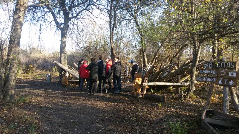 С чувством выполненного долга девятиклассники решили прогуляться дальше в лес … И кто бы мог подумать, что их  приключения только начинаются! Впереди их ждал настоящий сказочный «Старый сад» - уголок для отдыха в лесу. Место вызвало восторг и удивление. И надо же было такому случиться, что именно в этот момент приехал хозяин и основатель этого замечательного места – энтузиаст своего дела Григоров Валерий Александрович. Валерий Александрович оказался отличным знатоком истории Борисоглебска, Теллермановского леса и собственно аллеи Корнаковского. Его рассказ ребята выслушали с неподдельным интересом. А если учесть, что так называемая лекция о истории родного края проходила в историческом месте, то ценна она вдвойне. Но и гимназисты не остались в стороне от этого проекта, оказав посильную помощь в разгрузке стройматериалов и приведении зон отдыха в порядок.