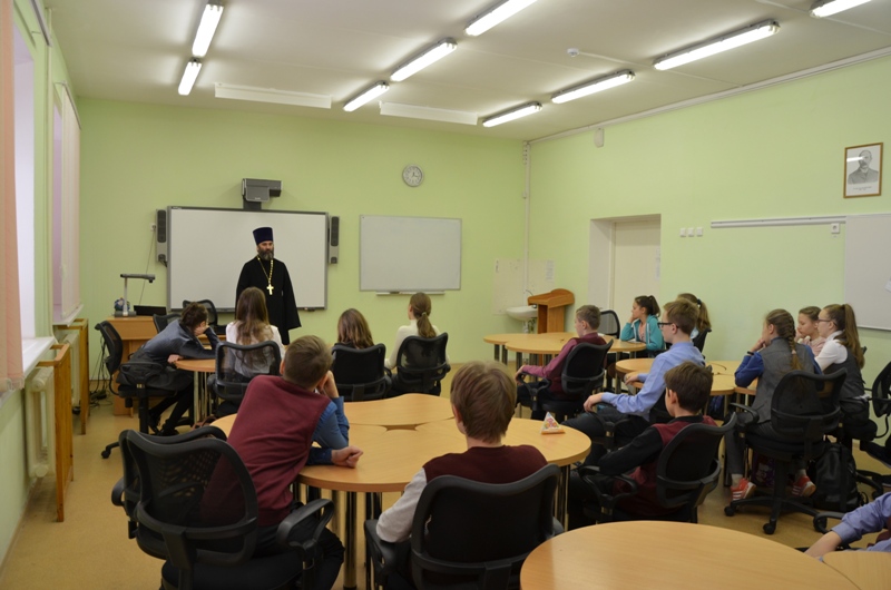 7 декабря 2018 г. настоятель храма Бориса и Глеба отец Александр поговорил с гимназистами 7 «Б» класса на тему «Экстремизм – угроза обществу». Отец Александр раскрыл современные понятия экстремизма и действующие в этой сфере законы России. Особое внимание священник уделил опасности вовлечения молодых людей в различные секты и экстремистские организации через сеть Интернет: «Человечество много воевало. За последние пять тысяч лет зафиксировано около 15000 больших и малых войн, в которых погибло несколько миллиардов человек. Люди продолжают спорить о территориях, о религиях, о взглядах, часто просто не принимая людей других конфессий, национальностей, социальных слоев. К сожалению, люди бывают нетерпимы к взглядам других, считают только свою точку зрения верной, — рассказывал священник. — Что же такое экстремизм? Это приверженность к крайним взглядам и мерам. Крайними мерами считаются противоречащие принятым общественным нормам действия. Экстремисты выступают против сложившихся государственных и общественных институтов, стремясь подорвать их существующие, изменить или уничтожить их для достижения своих целей. Экстремисты отрицают саму возможность каких-либо компромиссов, переговоров, соглашений. Мы с вами — граждане одного государства: Российской Федерации. В нашей стране, в нашем городе проживают люди множества разных национальностей и вероисповеданий. Поэтому важно научиться уважать культурные ценности как своего народа, так и представителей другой культуры или религии, научиться находить точки соприкосновения, быть терпимыми к чужому образу жизни, поведению, обычаям, чувствам, мнениям, идеям и верованиям».