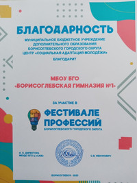 Программа данного мероприятия была насыщенной. На открытии Фестиваля до всех присутствующих была доведена информация о рынке труда, наиболее востребованных в БГО профессиях, о возможностях целевого обучения как гарантии трудоустройства. Далее дети, родители и педагоги поделились на группы. Обучающиеся 8-9 классов посетили выставку "Навигатор поступления", старшеклассники приняли участие в панельной дискуссии "Профессия или призвание?", для родителей был организован тренинг "Как помочь старшекласснику в профессиональном самоопределении", а для педагогов организаторы провели мастер-класс "Использование нарративных техник при профориентационной деятельности". Закончился Фестиваль блиц-викториной, которая содержала вопросы на знание особенностей профессий и учебных заведений нашего города. Гимназисты, их родители и учителя благодарят организаторов мероприятия за интересный день, проведенный с пользой!