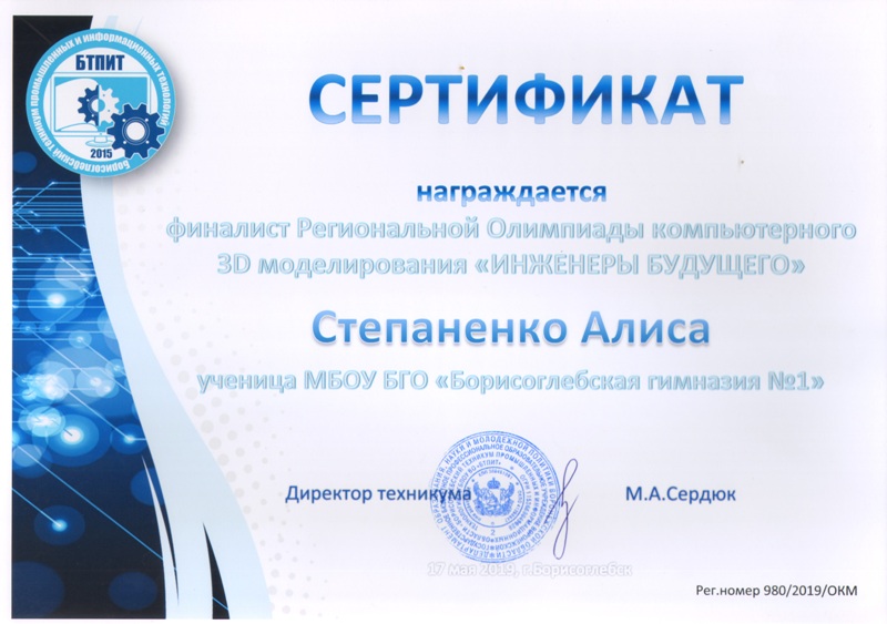 17 мая 2019 г. состоялся финал Региональной олимпиады компьютерного 3D моделирования для старшеклассников "Инженеры будущего"  на базе Государственного  бюджетного профессионального образовательного учреждения Воронежской области «Борисоглебский техникум промышленных и информационных технологий» (ГБПОУ ВО «БТПИТ»).