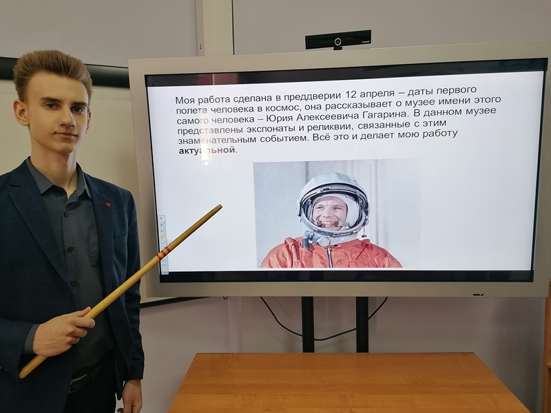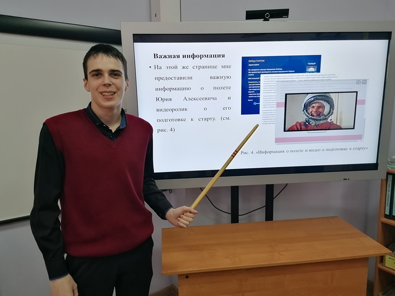 Подготовительную часть Гагаринского урока обучающиеся 10 класса посвятили различным виртуальным экскурсиям космической тематики. 6 апреля ребята сами выбрали заинтересовавшие их экспозиции в различных музеях страны: Музее центра подготовки космонавтов имени Ю.А. Гагарина, Объединённом мемориальном музее Ю.А. Гагарина, Московском Мемориальном музее космонавтики, музее истории космонавтики имени К.Э. Циолковского, Мемориальном доме-музее академика С.П. Королёва, музее космонавтики г. Ростова-на-Дону, Алтайском государственном мемориальном музее Г.С. Титова и даже Национальном музее Авиации и Космонавтики США. Своими впечатлениями от увиденного десятиклассники поделились в подготовленных отчётах-презентациях, с которыми выступили перед товарищами.