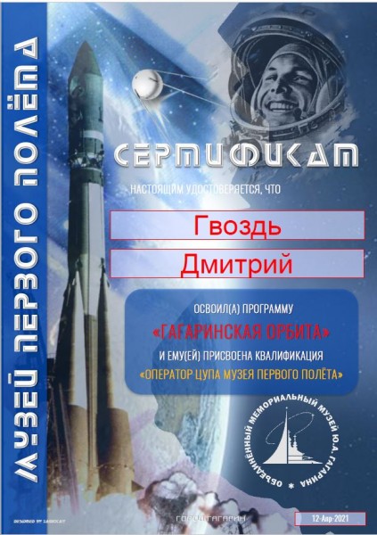 А Дмитрий Гвоздь во время своего виртуального посещения Объединённого мемориального музея Ю.А. Гагарина сумел успешно пройти различные тестирования по программе «Гагаринская орбита», по результатам которых ему была присвоена квалификация «Оператор ЦУПа музея первого полёта»!