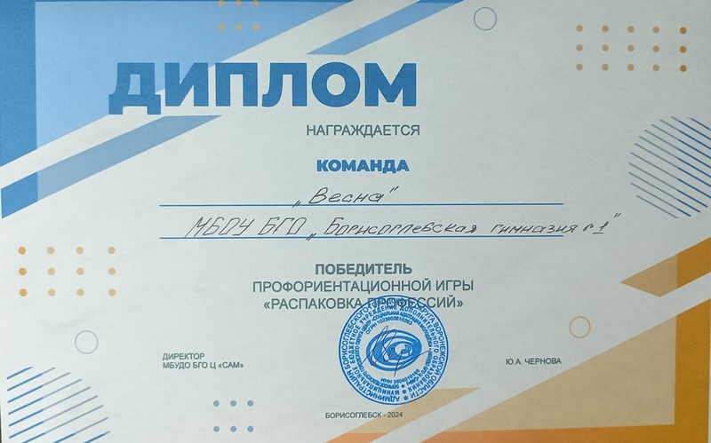 В завершении игры команды презентовали друг другу свои профессии, и по результатам общего голосования были определены победители игры. Ими стали команда обучающихся 8 "Б" класса «Весна» МБОУ БГО "Борисоглебская гимназия №1" (руководитель Щепкина Н.А.)