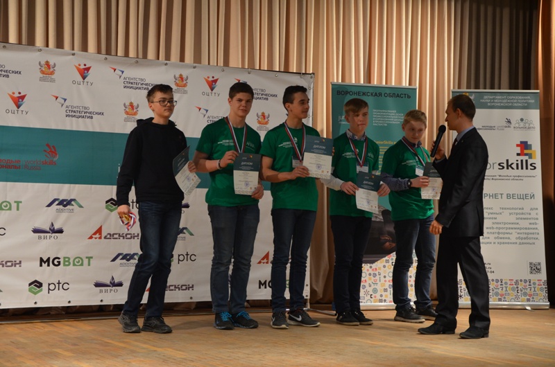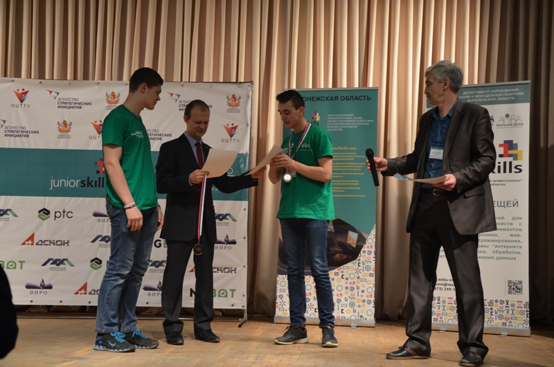 Руководитель регионального координационного центра движения JuniorSkills в Воронежской области Илья Андреевич Коржик, наградил победителей в компетенции «Мобильная робототехника» и поблагодарил индустриальных партнеров, ООО «Аскон-Воронеж», АО «Центр технологической компетенции аддитивных технологий», предоставивших оборудование и программные средства для проведения чемпионата. Региональный координатор движения JuniorSkillsв Воронежской области Анатолий Иванович Деревягин, отметил профессиональную работу экспертов и слаженную работу коллектива в период подготовки и проведения чемпионата.