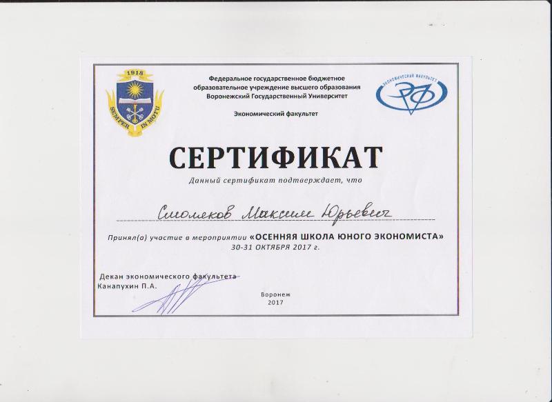 А наш гимназист, Смоляков Максим, обучающийся 10 класса, принял участие в Осенней школе юного экономиста на базе ВГУ.