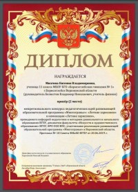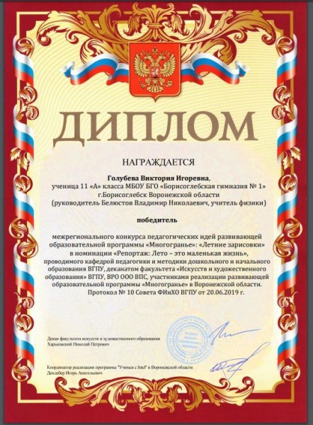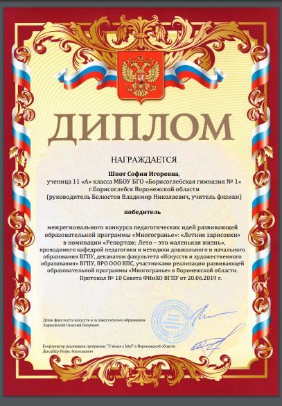 в номинации «Летние зарисовки»(работы иллюстрировались авторскими рисунками и фотографиями) 2 место (призёр) заняла обучающаяся 11 «Б» класса МБОУ БГО «Борисоглебская гимназия №1» Мизгина Евгения (руководитель Белюстов В.Н., учитель физики);
