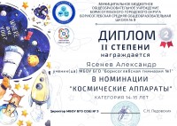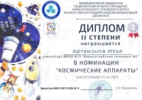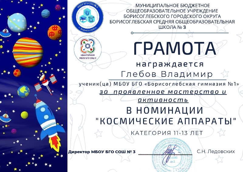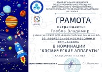 Грамотой за проявленное мастерство и активность в номинации «Космические аппараты» награждён обучающийся 4 класса Глебов Владимир (руководитель – Негадова О.П.).