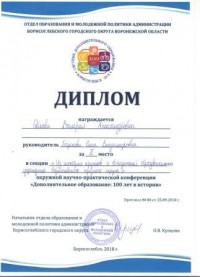 25 сентября на базе БФ ВГУ прошла научно-практическая конференция, посвященная 1000-летию системы дополнительного образования. С докладом «Одна страница вековой истории» выступила Рябкова Валерия, обучающаяся 9 «А» класса МБОУ БГО «Борисоглебская гимназия №1» (руководитель Барскова О.В., учитель истории) и заняла 2 место.