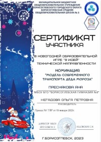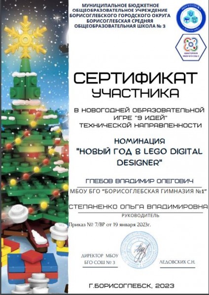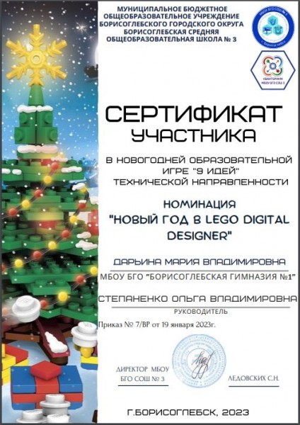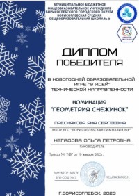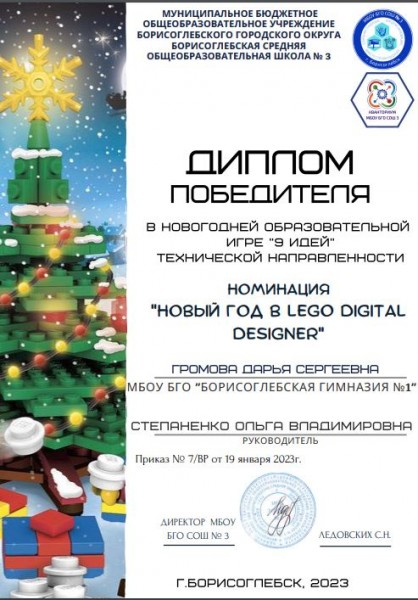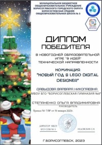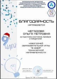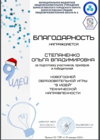 С 28 декабря 2022 г. по 15 января 2023 года состоялась новогодняя образовательная игра "9 идей" технической направленности, организованная Школьным технопарком "Кванториум" МБОУ БГО СОШ N3. В игре приняло участие 110 учеников с разных уголков нашей страны. Много интересных, оригинальных, "сказочно-новогодних" заданий игры выполнили её участники.