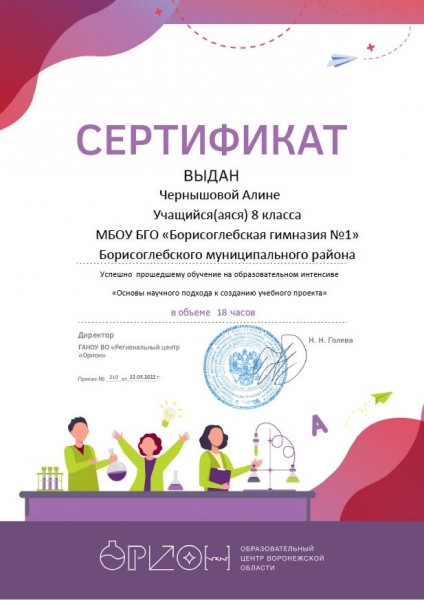 Алина получила также сертификат о прохождении дистанционного курса «Основы научного подхода к созданию учебного проекта» (18 часов) в ГАНОУ ВО «Региональный центр "Орион"».