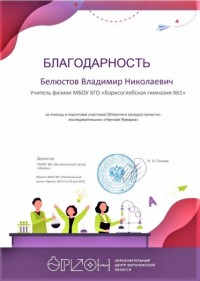В период с 7 февраля по 29 мая 2022 года Государственное автономное нетиповое образовательное учреждение Воронежской области «Региональный центр "Орион"» проводил для школьников 7 – 9 классов областной конкурс учебно-исследовательских проектов «Научная ярмарка», в котором приняла участие обучающаяся 8 класса МБОУ БГО «Борисоглебская гимназия №1» Чернышова Алина (руководитель Белюстов В.Н., учитель физики).