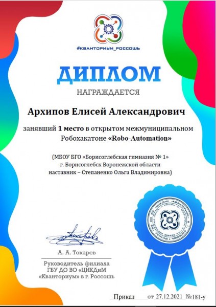 • 1 место - Архипов Елисей (МБОУ БГО «Борисоглебская гимназия № 1», наставник - Степаненко О.В., учитель информатики)
