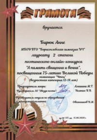 В онлайн-конкурсе приняли участие ученицы 7 класса (учитель и классный руководитель Крылова Э.В.). На днях были объявлены результаты поэтического онлайн-конкурса в номинации «Чтец» (возрастная категория 12-14 лет):